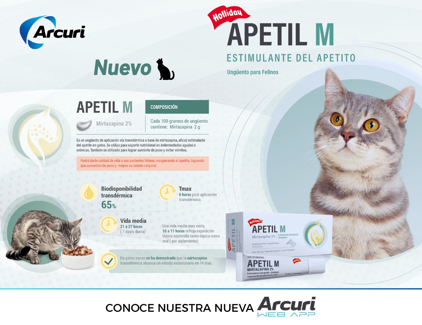 Apetil M es un estimulante del apetito de uso veterinario formulado a base de mirtazapina, diseñado para favorecer la ingesta alimentaria y el aumento de peso en gatos. Su acción central ayuda a activar el apetito de forma eficaz, siendo una herramienta clave en pacientes con disminución del consumo o estados de debilidad.