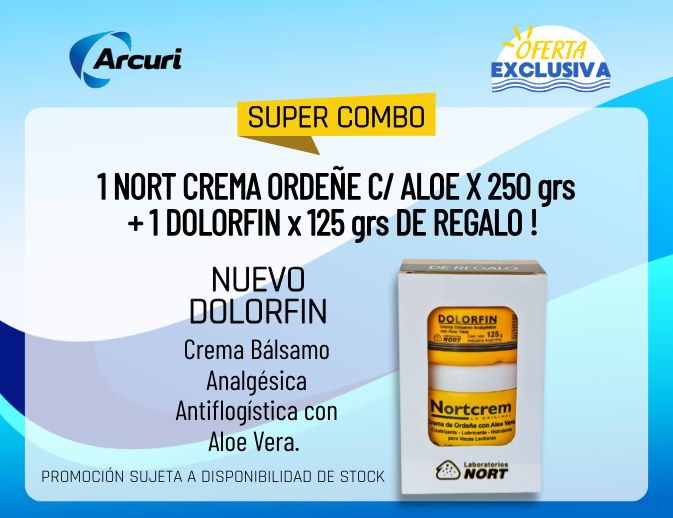 Llevando Nort Crema Ordeñe con Aloe 250 g, recibís Dolorfin Crema Bálsamo Analgésica 125 g de regalo, ideal para complementar el tratamiento con acción antiinflamatoria y calmante.