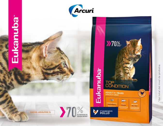 Formulado para gatos adultos a partir del año de edad, Eukanuba Top Condition ofrece una nutrición completa que acompaña su bienestar diario y potencia su vitalidad. Con ingredientes de alta calidad y un 70% de proteína de origen animal, este alimento está diseñado para sostener su salud general y mantenerlo activo, sano y lleno de energía.